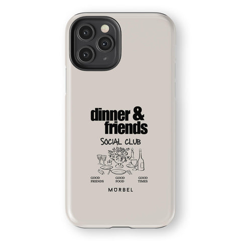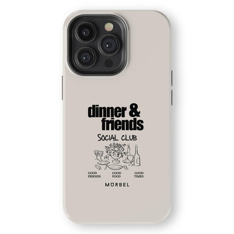 Beige background with black text. Features clean outline illustrations of a dinner table setup—plates, cutlery, wine glasses—and warm moments shared among friends. Simple, elegant, and full of connection.