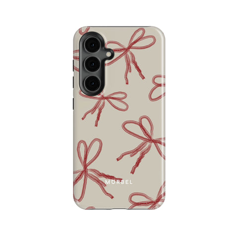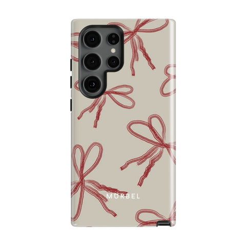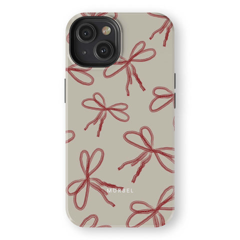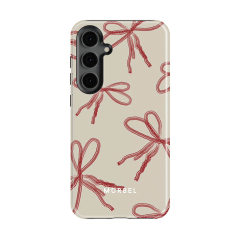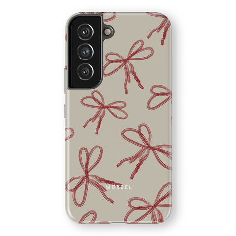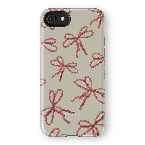 Elevate your device with this beige phone case adorned with red abstract ribbons. Each ribbon evokes a sense of joy and anticipation, as if unwrapping a cherished gift every time you reach for your phone.